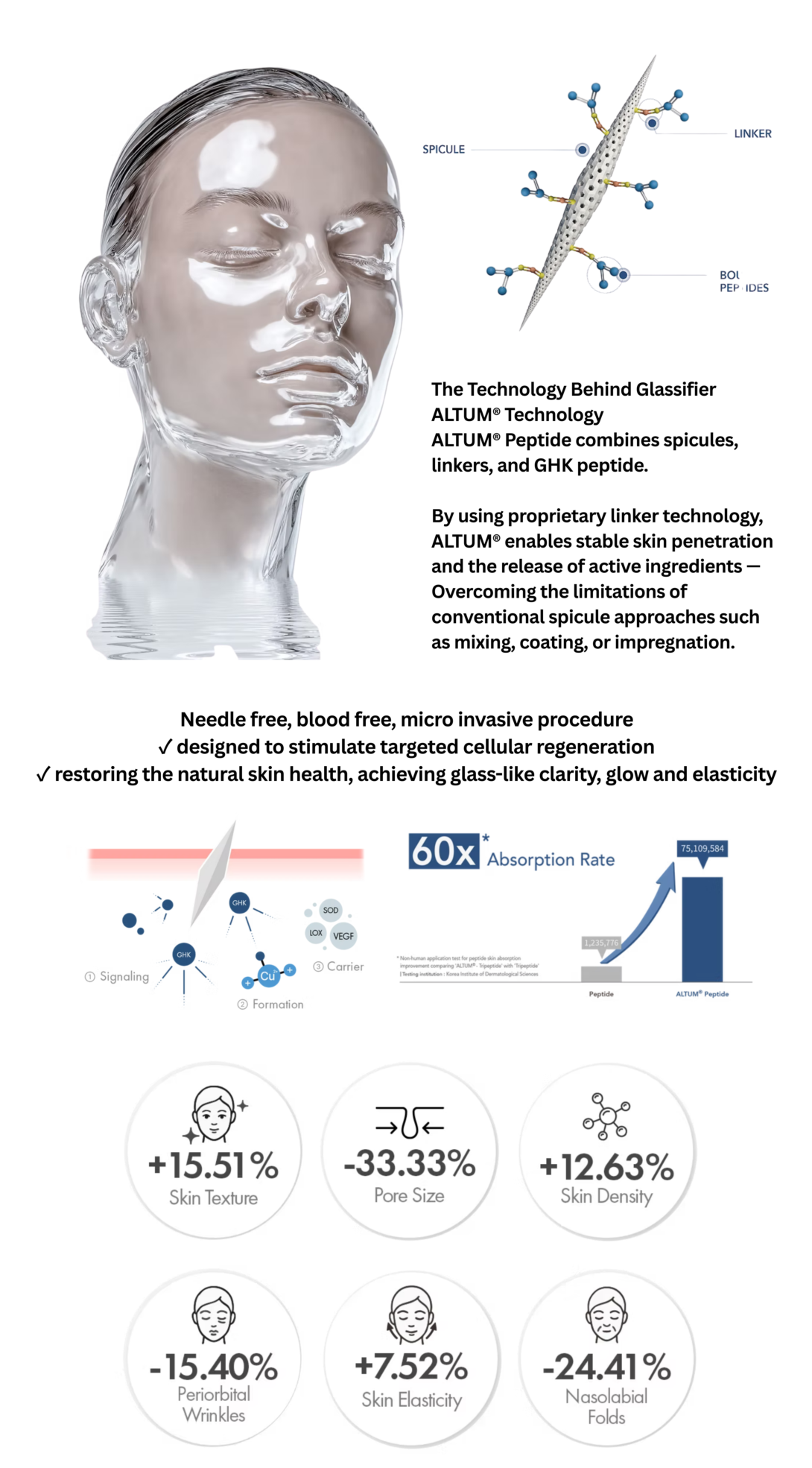 Designed to bridge the gaps left by energy-based devices and injectables. By addressing skin structure and texture, Glassifier maximizes the efficacy of combined treatments.
